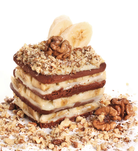 Mljevene kekse prelijte sokom od naranče i dobro promješajte. Posebno izmješajte margarin i šećer u prahu. Dodajte natopljene kekse, mljevne orahe i promješajte, da dobijete kompaktnu smjesu. Ovu smjesu razdijelite na dva dijela. Kalup za tortu obložite folijom pa po njoj premažite polovinu nadjeva, banane poškropite limunovim sokom i poslažite ih na nadjev. U drugi dio nadjeva dodajte rastopljenu čokoladu i sve dobro promješajte. Ovu smjesu rasporedite po bananama pa izravnajte. Istucite slatko vrhnje i njime premažite tortu. Tortu stavite u hladnjak da se stvrdne pa je izvadite iz kalupa.