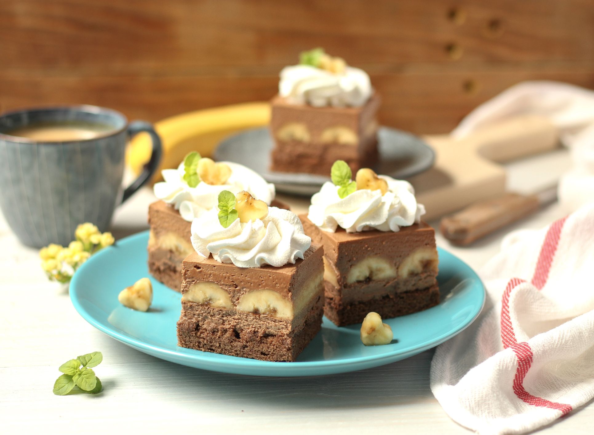 Na biskvit staviti pola kreme, pa posložiti banane prerezane po dužini na pola i pokapane limunovim sokom. Na banane staviti drugi dio kreme. Izmiksati vrhnje za šlag i slastičarskom vrećicom sa zvjezdastim nastavkom ukrasiti kolač.