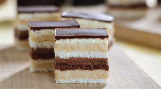 svijetla kora, svijetla krema, tamna kora, tamna krema, svjetla kora, svje­tla krema. Na gotov kolač staviti šlag (2,5 dcl) i čokoladnu glazuru.