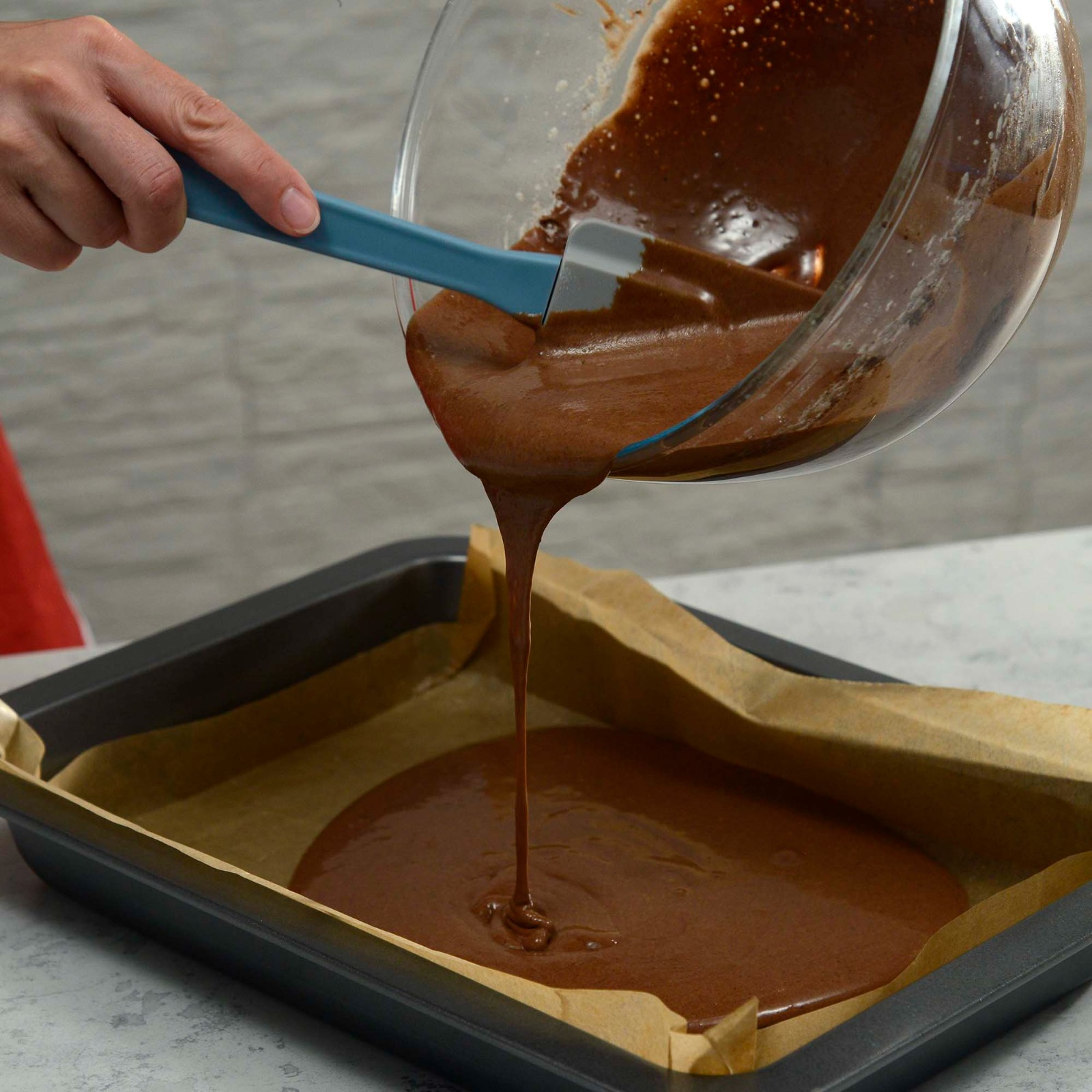 Smjesu uliti u papirom za pečenje obložen kalup dimenzije 30 x 22 cm. Peći na 180 °C, 20 – 30 minuta. Provjeriti čačkalicom kad je pečeno.