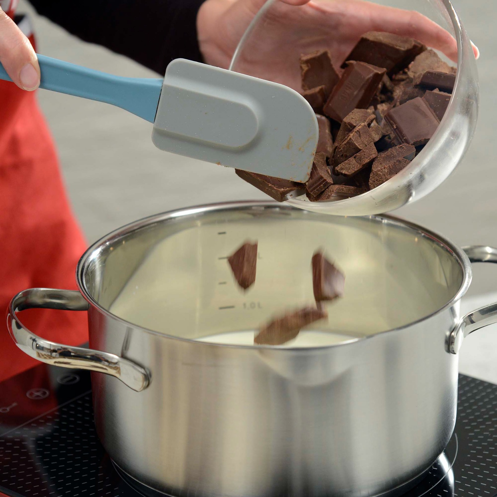 Na laganoj vatri otopiti čokoladu u vrhnju za šlag. Pečeni biskvit izbockati vilicom i politi s 3⁄4 soka iz kompota.