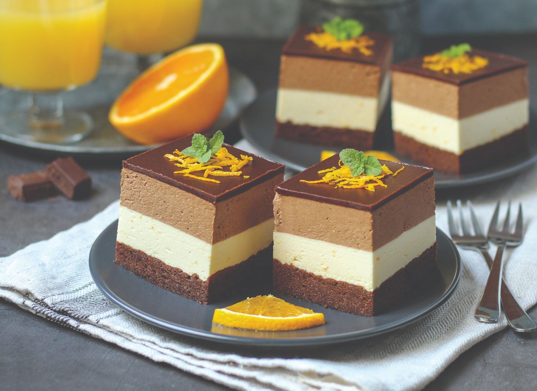 Jaja i šećer kuhati na pari te cijelo vrijeme tući pjenjačom, 5 – 10 minuta, dok se ne počne zgušnjavati. Dodati sjeckanu čokoladu te miješati dok se ne otopi. Maknuti s pare, ohladiti nekoliko minuta te pažljivo špatulom umiješati čvrsto tučeno vrhnje. Namazati po ohlađenoj kremi od naranče, poravnati i staviti u hladnjak najmanje na nekoliko sati da se stegne.
