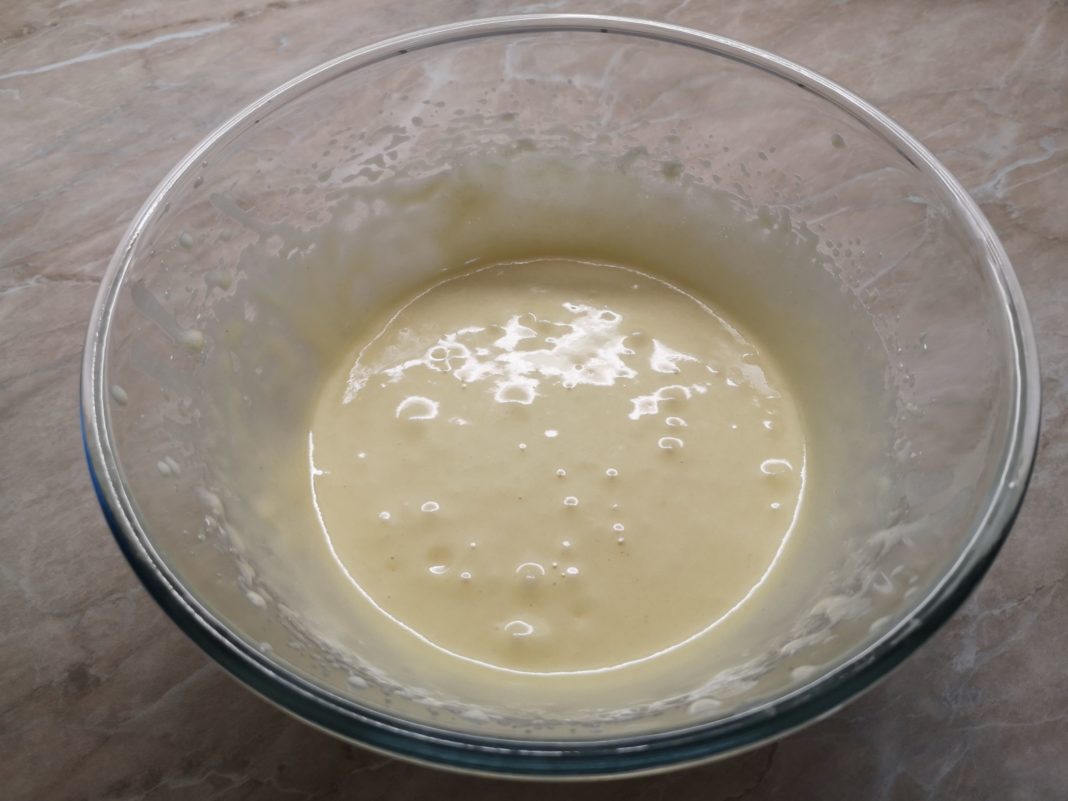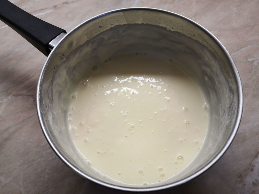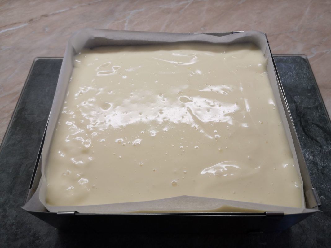 U malo mlijeka razmutiti puding, pa ukuhati u ostatak mlijeka sa šećerom. Kuhati neprestano miješajući dok se ne zgusne i maknuti s vatre. U vruće umiksati kiselo vrhnje. Rasporediti vruću kremu na malo ohlađen biskvit i ohladiti u hladnjaku prije preljeva.