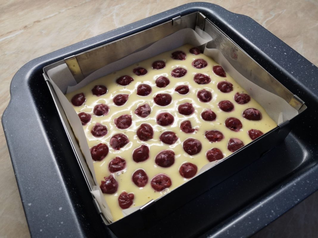 Pjenasto izmiksati jaja sa šećerom i vanilin šećerom, pa dodati ulje, jogurt, brašno i prašak za pecivo. Dobro izmiješati. Smjesu rasporediti u kalup za pečenje obložen papirom za pečenje dimenzije 35 x 22 cm, a po vrhu poslagati ocijeđene višnje iz kompota, uvaljane u malo brašna. Peći u zagrijanoj pećnici na 180 °C, oko 20 minuta.
