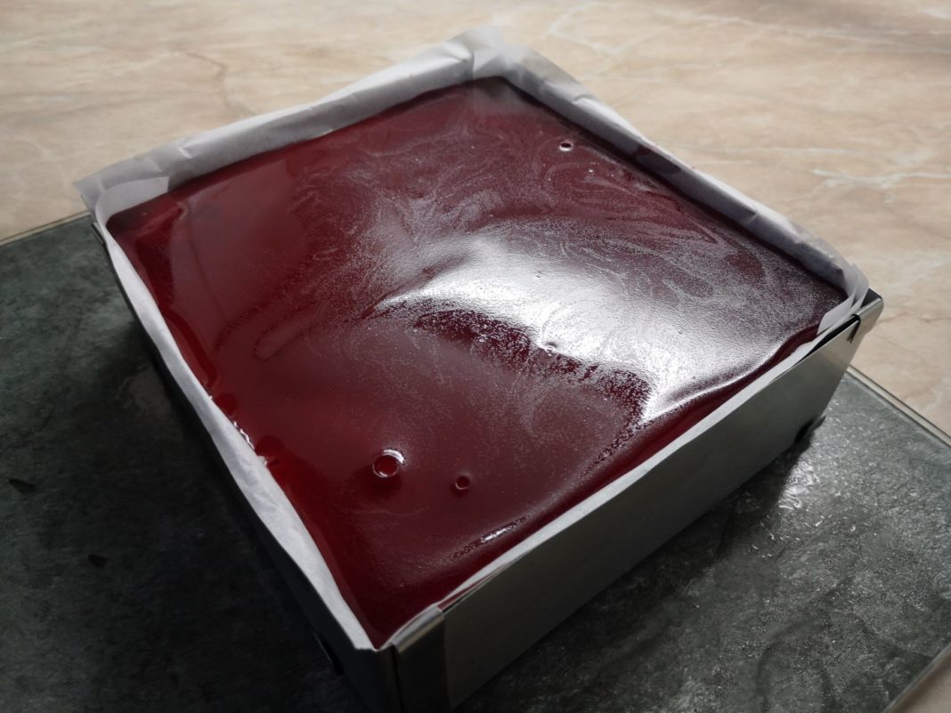 Pripremiti preljev za torte sa sokom od višanja prema uputi s pakiranja. Par minuta ohladiti i polako preliti po ohlađenom kolaču. Dobro ohladiti u hladnjaku.