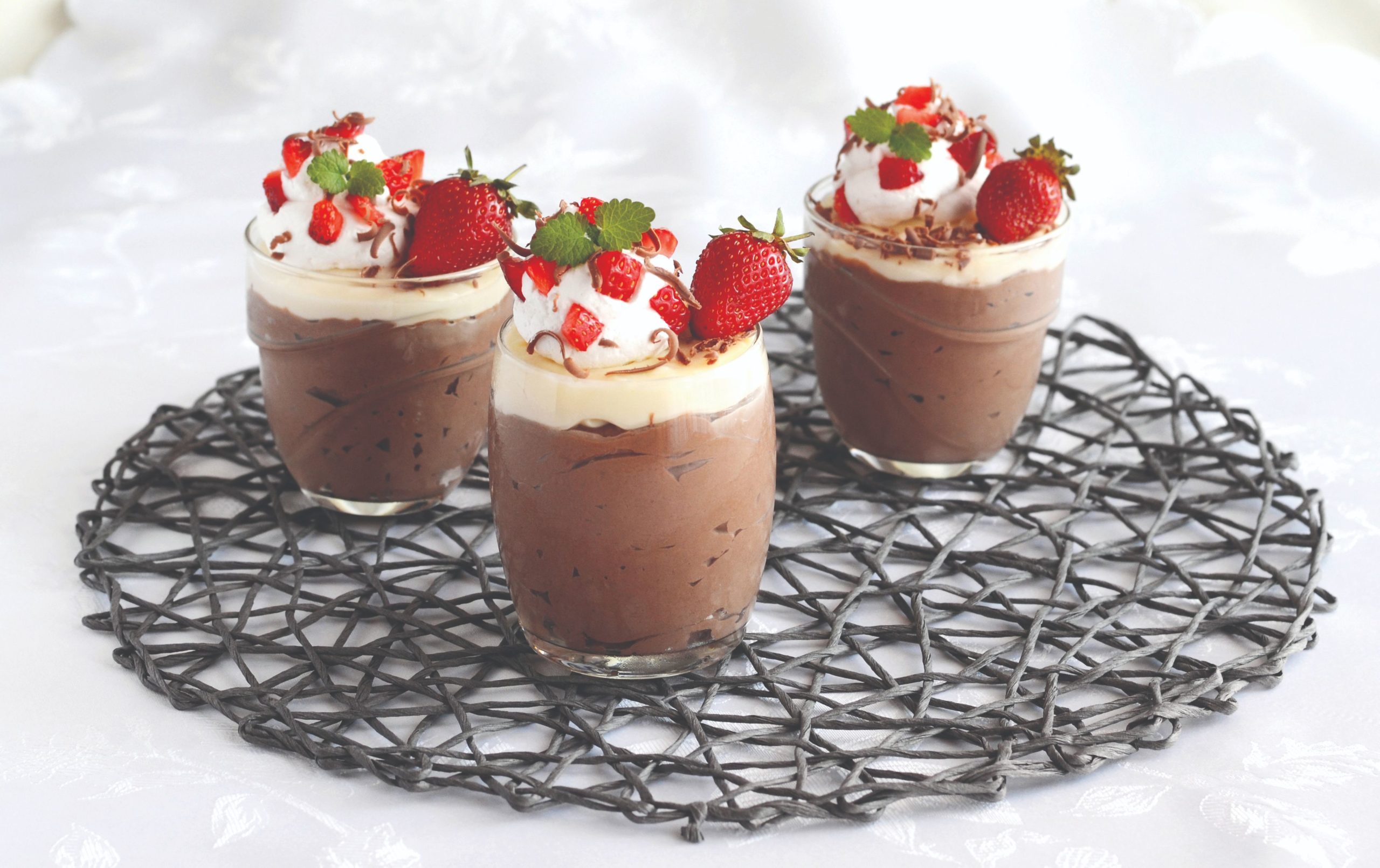 Duo ljepota. Sadrži puding od čokolade i jagode. Osim toga, satojci su mu još bijela čokolada, čoklada za kuhanje i šlag. Recept je iz knjige Moji čokoladni kolači.
