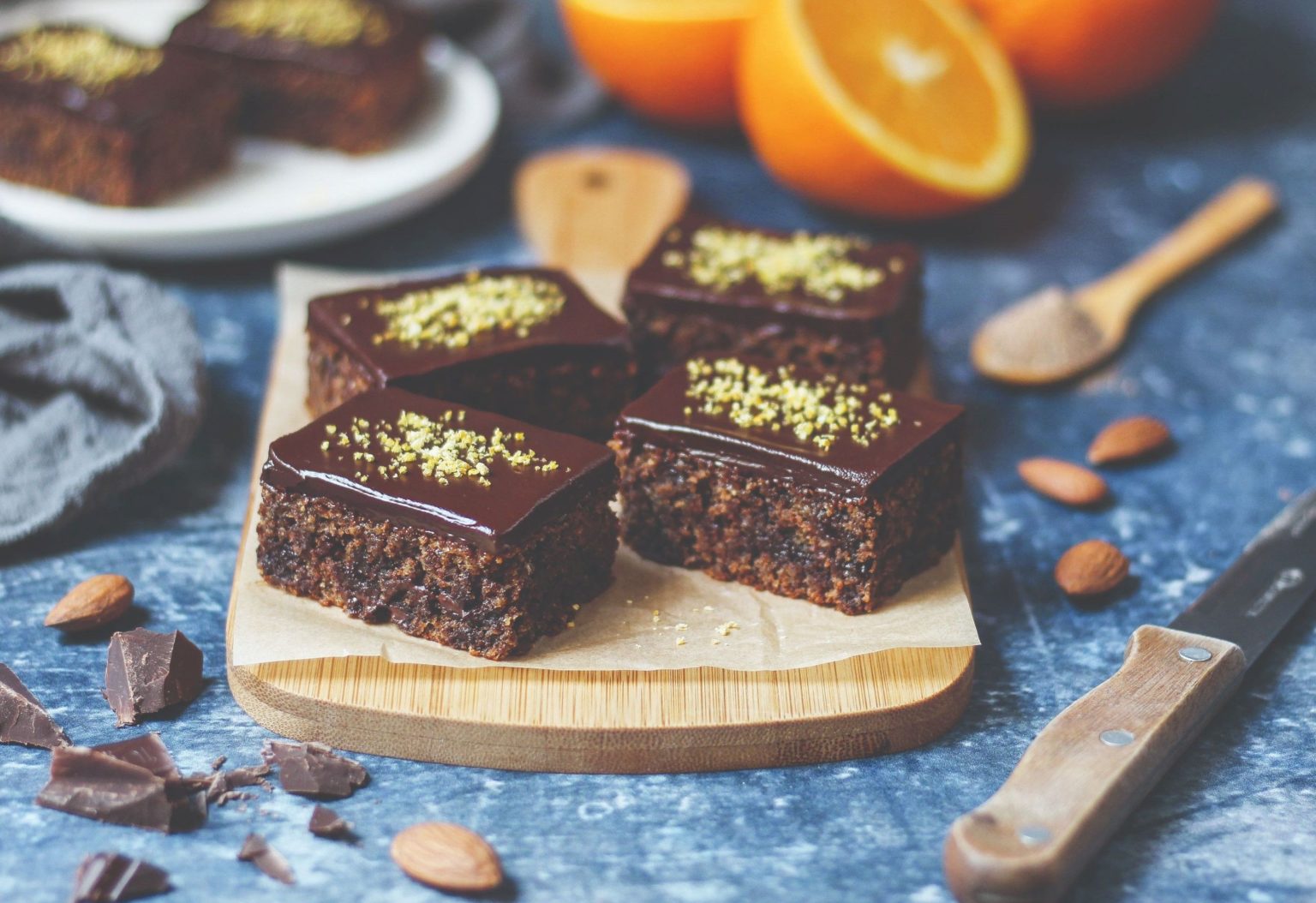 Miksati žumanjke sa šećerom. Dodati pomiješane mljevene bademe, rogač i prašak za pecivo, a zatim i koricu naranče i pola soka od naranče pa sve zajedno izmiksati. Dodati preostali sok od naranče i grubo sjeckanu čokoladu za kuhanje pa kratko izmiksati. Bjelanjke izraditi u čvrsti snijeg s vanilin šećerom i ručno lagano umiješati u smjesu. Uliti u kalup prekriven papirom za pečenje dimenzije 20 x 30 cm. Peći oko 25 minuta u zagrijanoj pećnici na 180 °C.