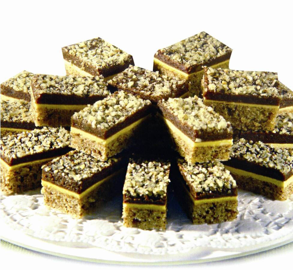 Umutite margarin sa šećerom i naizmjence dodajte mljevene orahe, brašno i prašak za pecivo sa snijegom od bjelanjaka. Ispecite tijesto i još vruće prelijte žutom glazurom. Ostavite na toplome da se suši.
