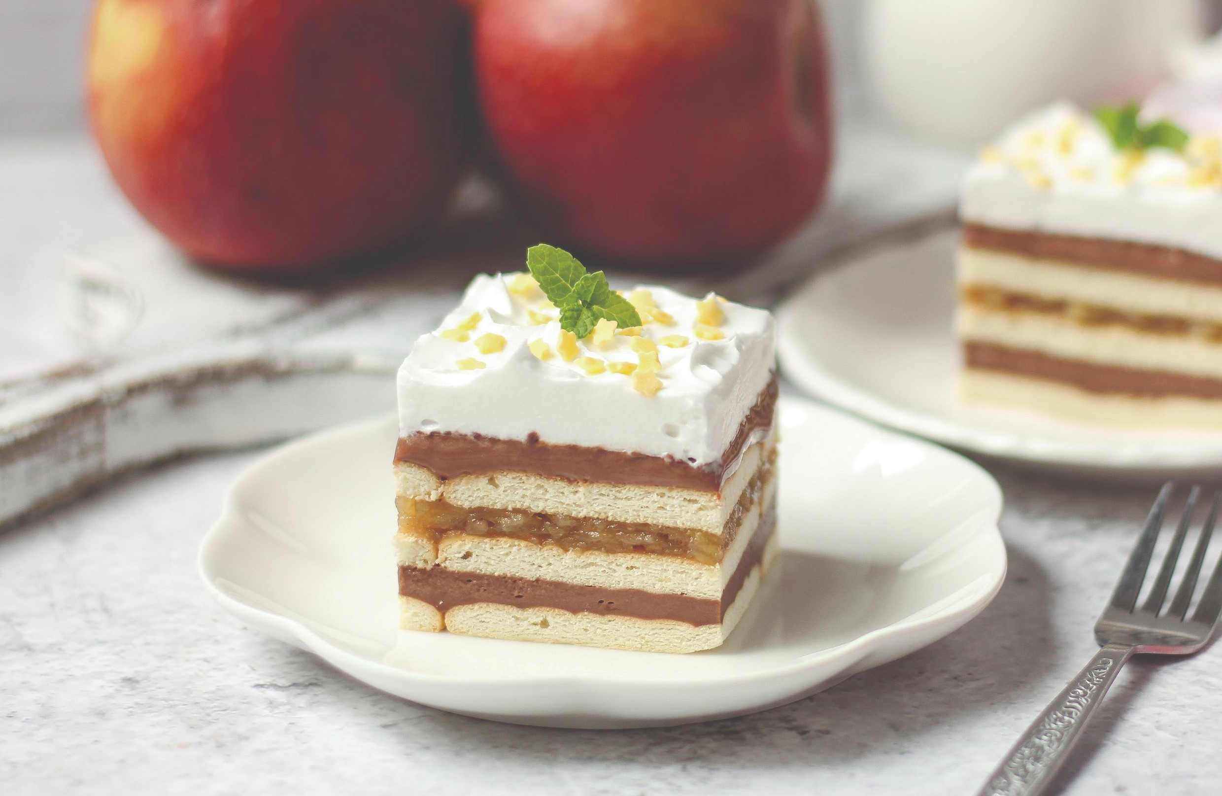 Jabuke oprati, oguliti, naribati i staviti kuhati sa šećerom, vanilin šećerom, cimetom i pola količine vode. Kuhati 5 – 10 minuta dok jabuke ne omekšaju. U ostatku vode razmutiti puding i ukuhati u jabuke cijelo vrijeme miješajući. Maknuti s vatre kad se zgusne. U dublji kalup dimenzije 28 x 25 složiti red petit keksa bez močenja pa staviti pola kreme od čokolade, opet petit keks pa rasporediti kremu od jabuka, keks, ostatak čokoladnog pudinga. Kolač staviti u hladnjak preko noći da se ohladi i stisne. Sutradan premazati čvrsto tučenim vrhnjem za šlag.