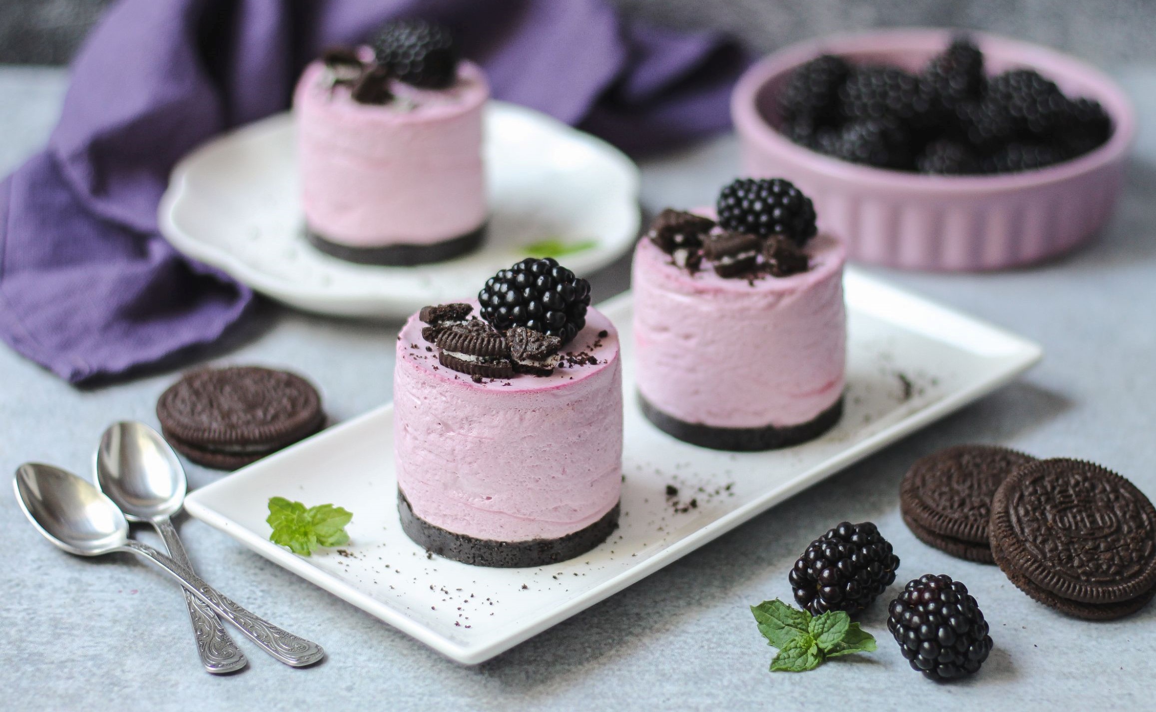 Kupine, vodu i šećer staviti kuhati par minuta dok se kupine ne raskuhaju. Protisnuti ih kroz cjedilo ili propasirati da se odstrane koštice. Želatinu pomiješati sa 8 žlica hladne vode i ostaviti da nabubri. Otopiti na najmanjoj vatri, pomiješati sa sokom od kupina, pa malo ohladiti. Izmiksati vrhnje u mekši šlag i dodati voćni jogurt. Na kraju dodati sok od kupina i sve žlicom promiješati. Puniti kalupe kremom i ostaviti u hladnjaku par sati ili preko noći da se ohladi i stisne. Ukrasiti kupinama i mrvljenim Oreo keksima.