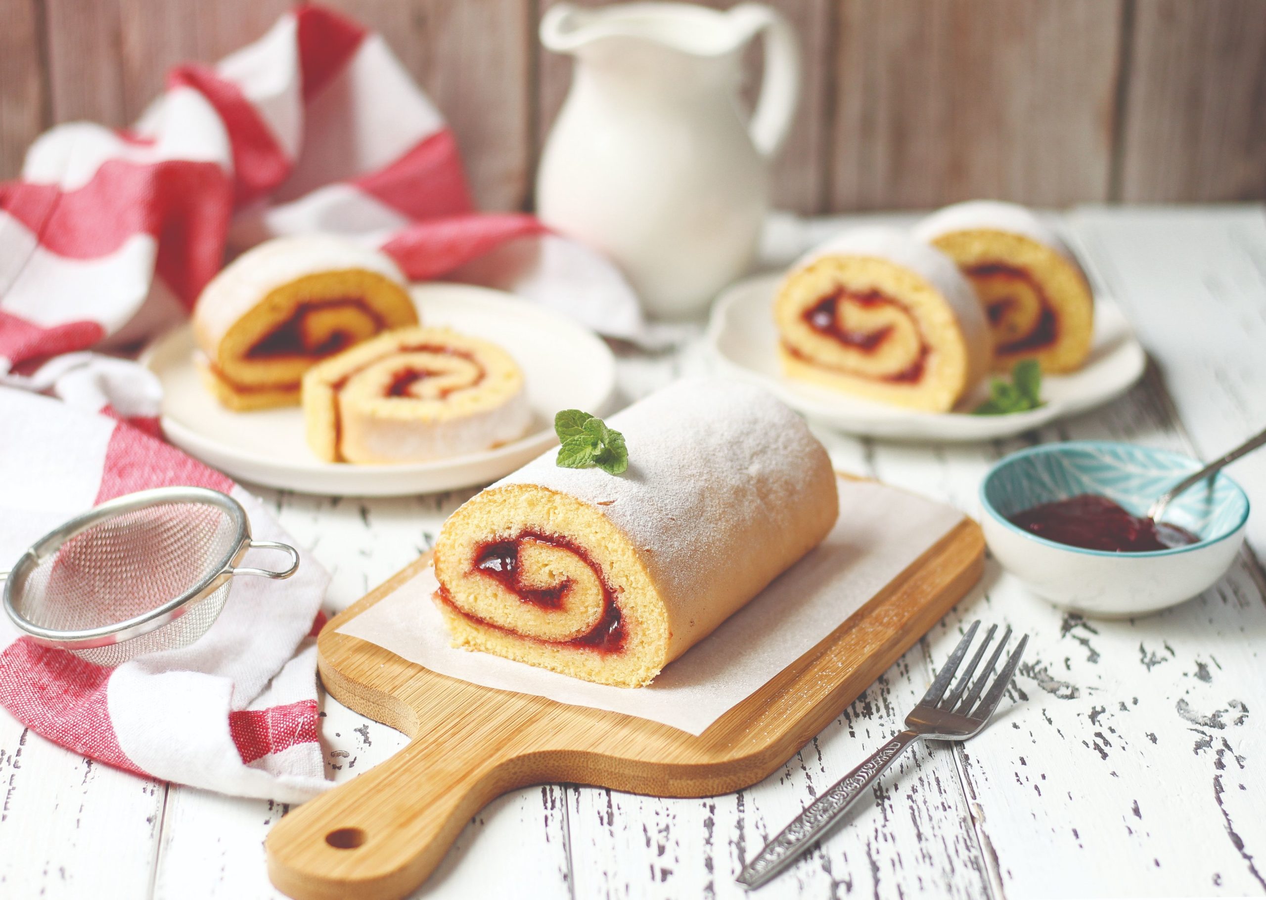 Biskvit odrolati, maknuti papir za pečenje, premazati džemom i ponovo zarolati. Ohladiti i posuti šećerom u prahu.