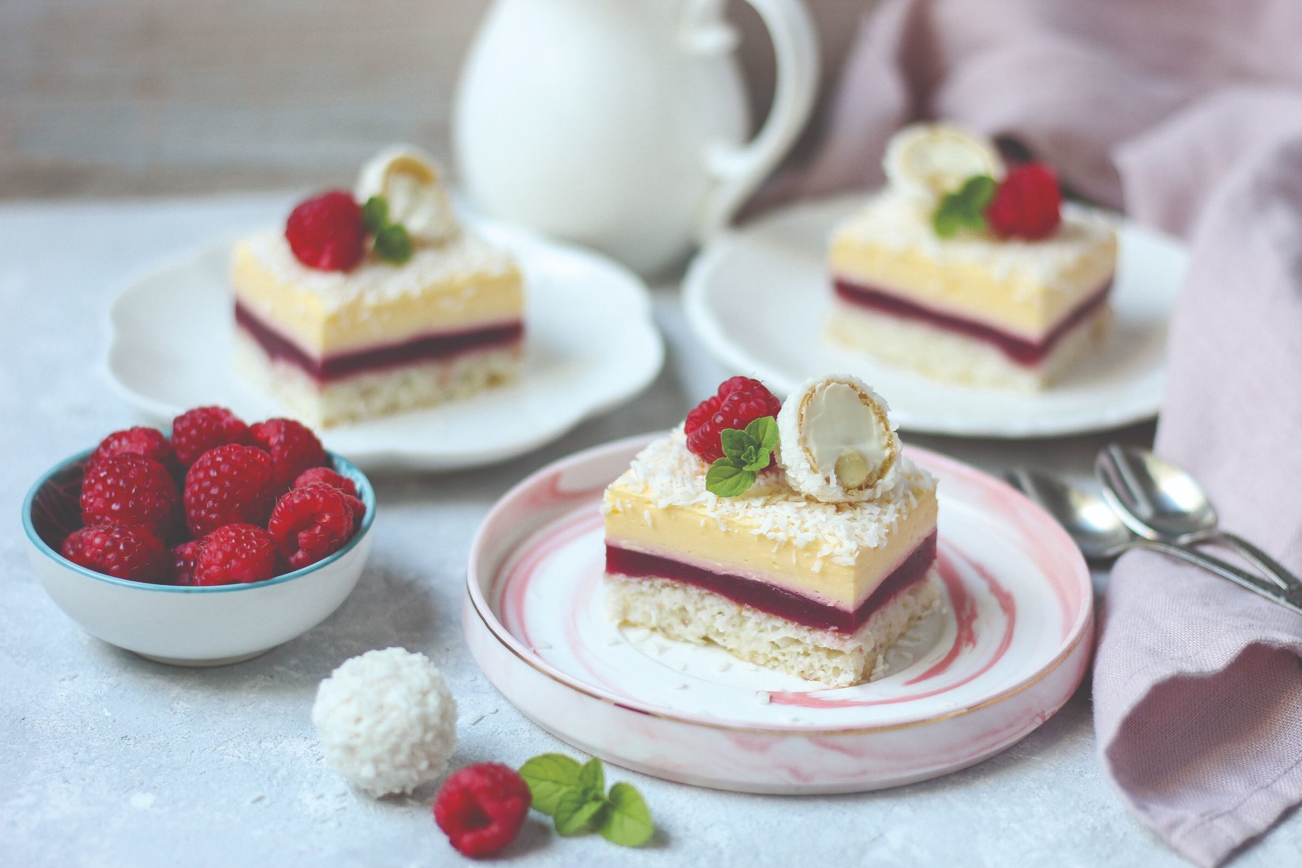 Pjenjačom izmiješati žumanjke, šećer, puding, škrobno brašno i malo mlijeka, pa ukuhati u ostatak mlijeka neprestano miješajući pjenjačom. Maknuti s vatre kad se zgusne i pokriti prozirnom folijom da se ohladi. U ohlađeno umiksati maslac sobne temperature. Premazati po ohlađenom želeu od malina i posipati kokosovim brašnom.