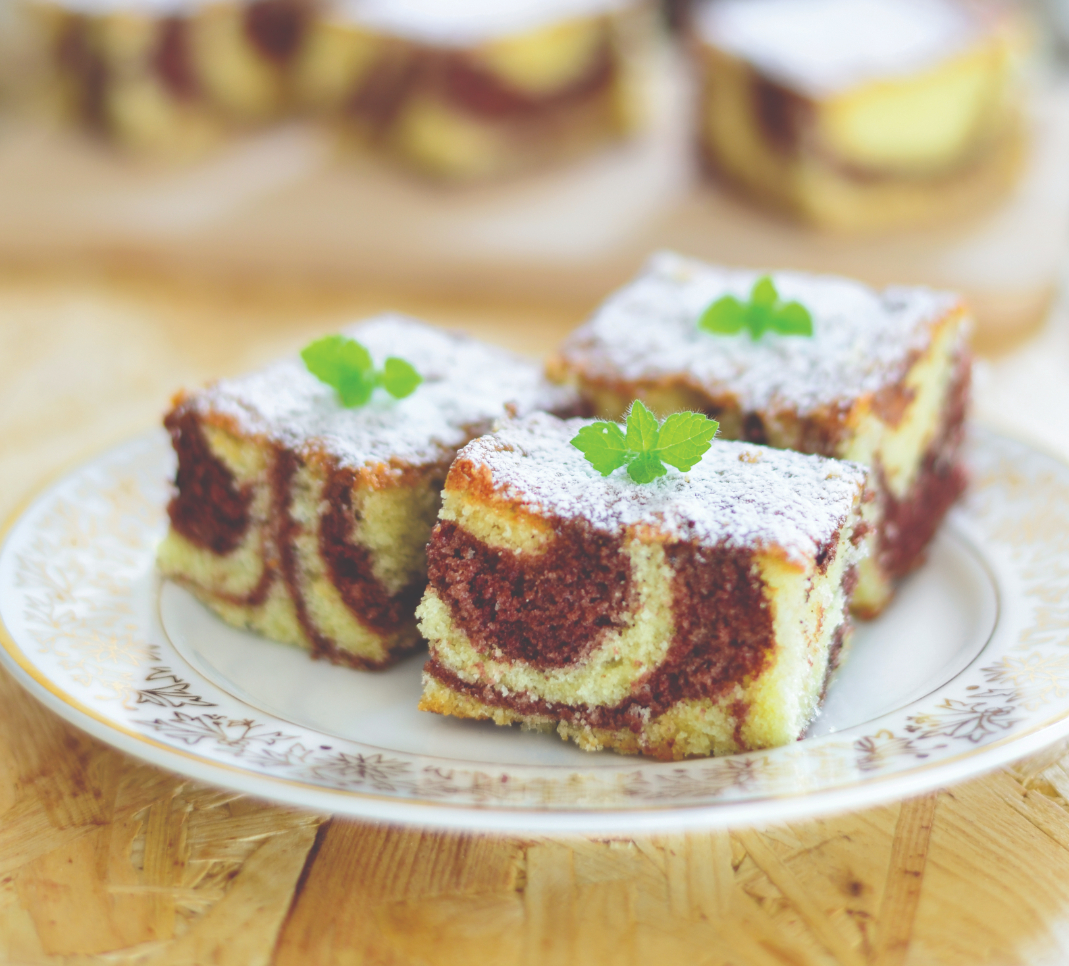 Mramorni kolač. Prefini biskvitni kolač prošaran slojevima svijetlog i tamnog biskvita mramornog izgleda, otkuda mu i ime. Savršen za nedjeljna popodneva.