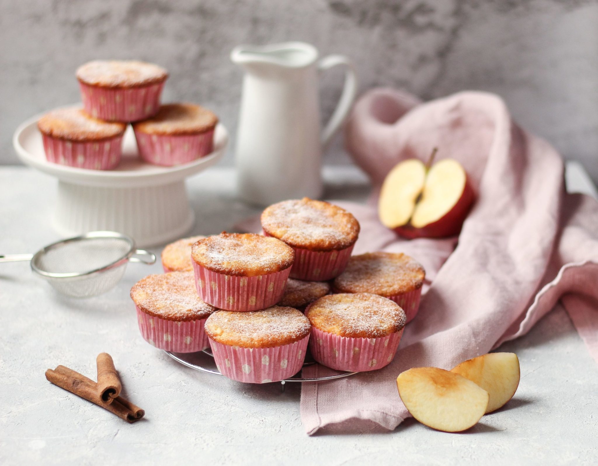 Jabuke oguliti, krupnije naribati i pomiješati s limunovim sokom. Pomiješati brašno, prašak za pecivo, šećer i cimet. Suhim sastojcima dodati vilicom umućeno jaje, aromu vanilije, ulje i jogurt te sve dobro izmiješati pjenjačom u glatku smjesu. Na kraju žlicom umiješati ribane jabuke. Smjesom puniti kalupe za muffine obložene papirnatim košaricama i peći na 180 °C oko 25 minuta. Pečene ostaviti par minuta da se ohlade u kalupu pa ih izvaditi i posipati šećerom u prahu.