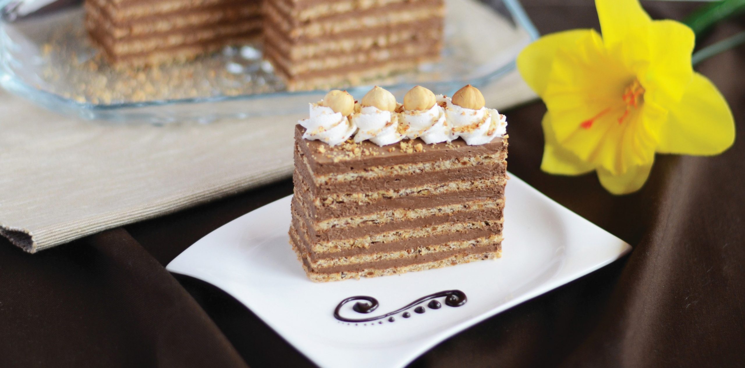 Miksati bjelanjke u čvrst snijeg. Postupno dodavati šećer miksajući, te pjenjačom lagano umiješati mljevene lješnjake. Peći u kalupu dimenzije 32 x 34 cm obloženom papirom za pečenje na 180 °C oko 20 minuta. Ponoviti postupak još dva puta. Svaku koru prerezati, da dobijemo 6 kora.