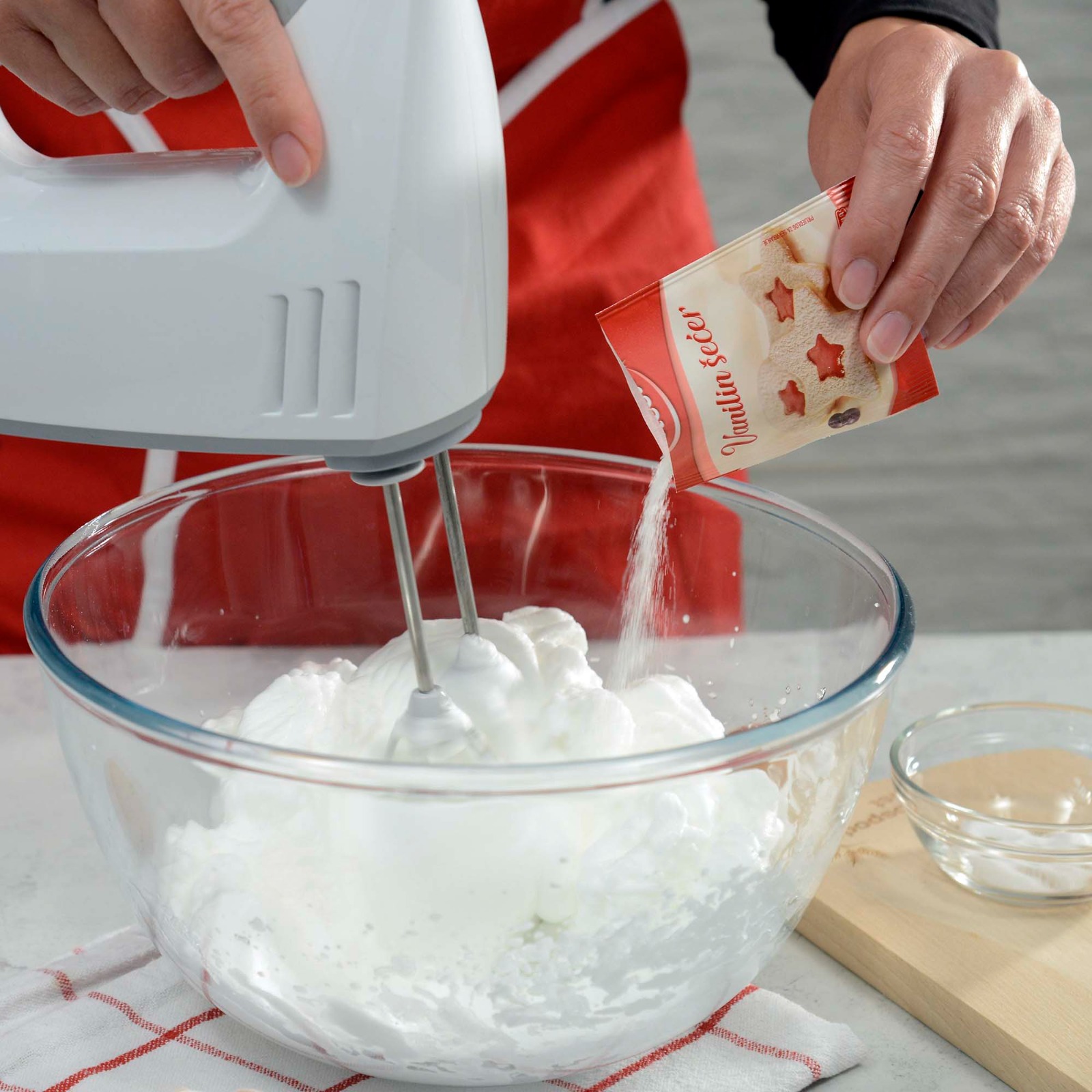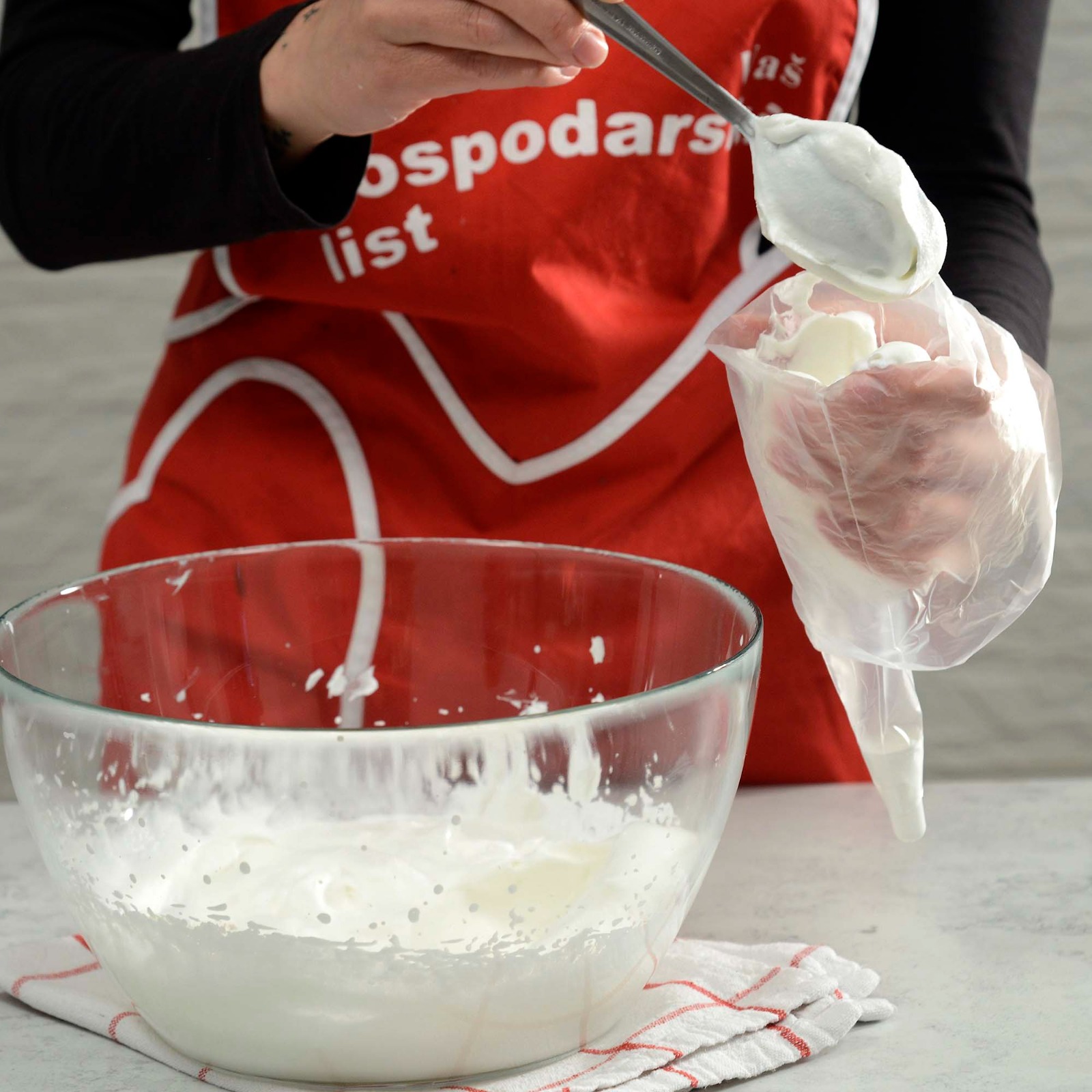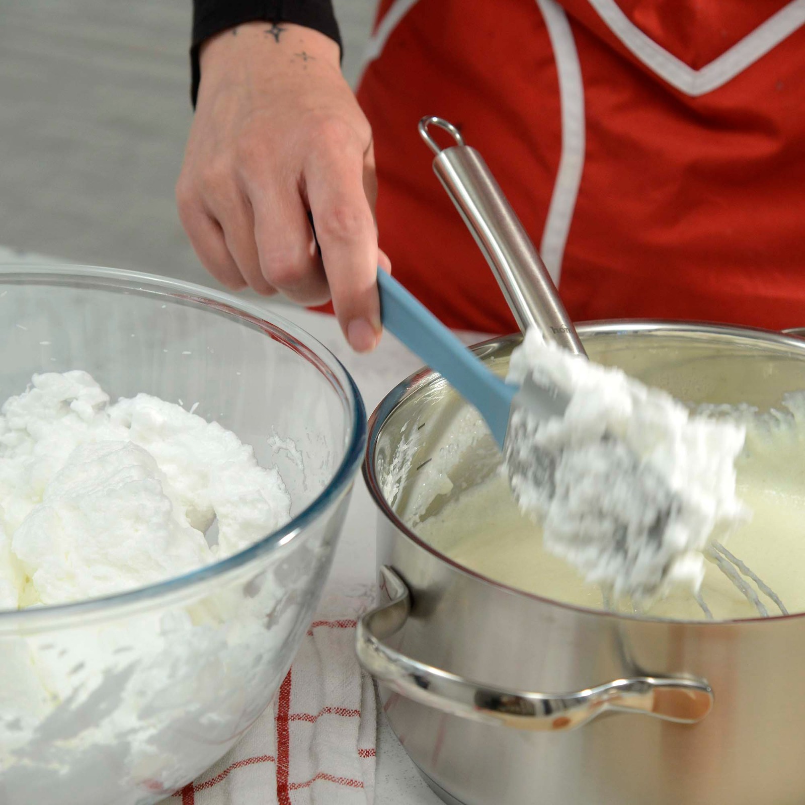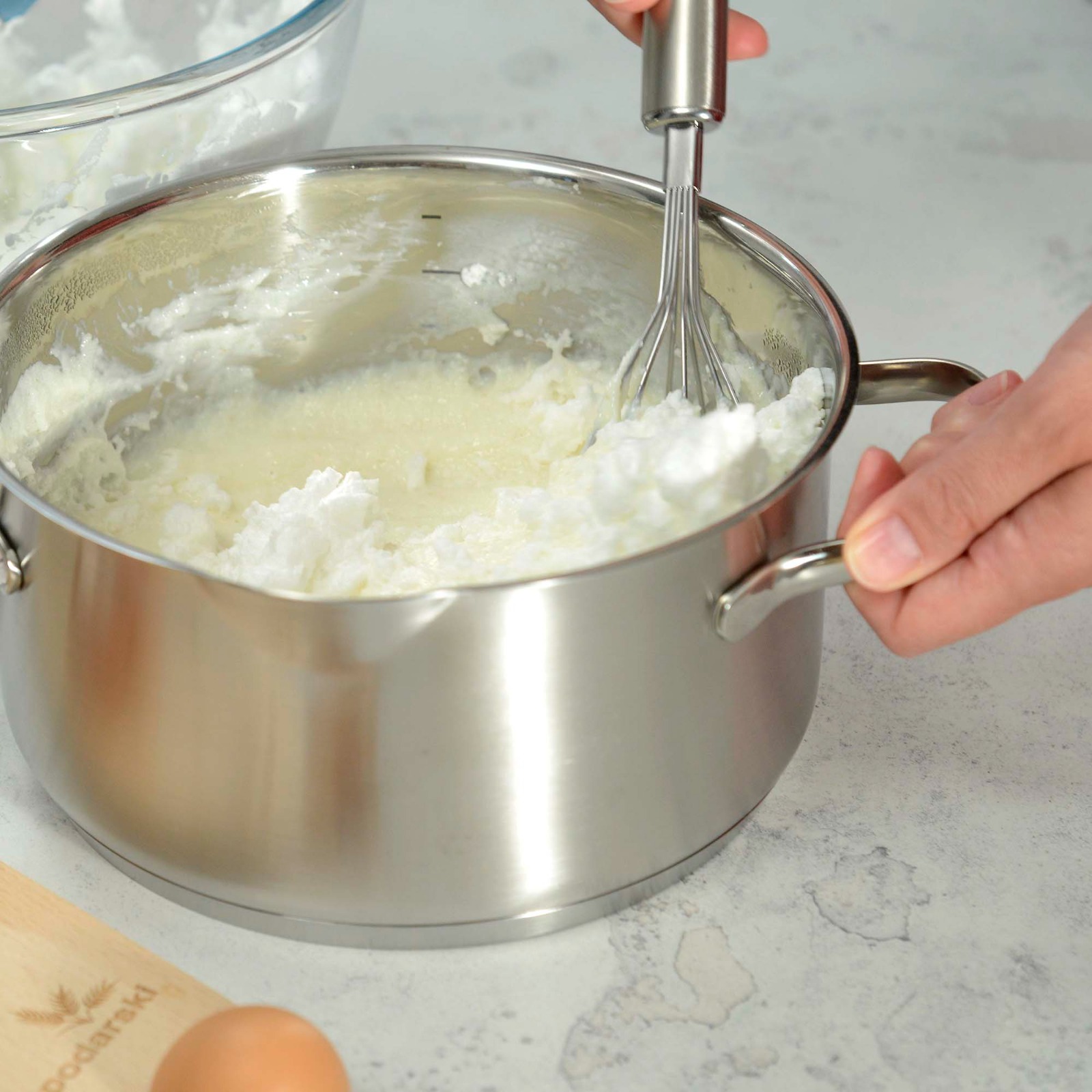 Maknuti s vatre i u toplo lagano umije­šati izmiksane bjelanjke u snijeg s vanilin šećerom.