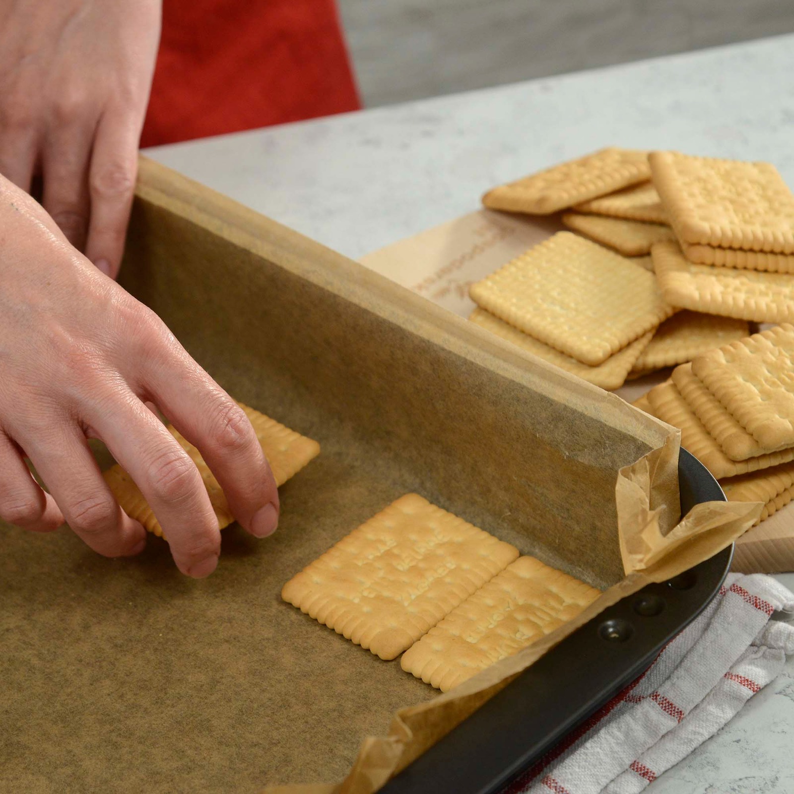 Posložiti petit kekse po dnu kalupa di­menzije 35 x 23 cm.