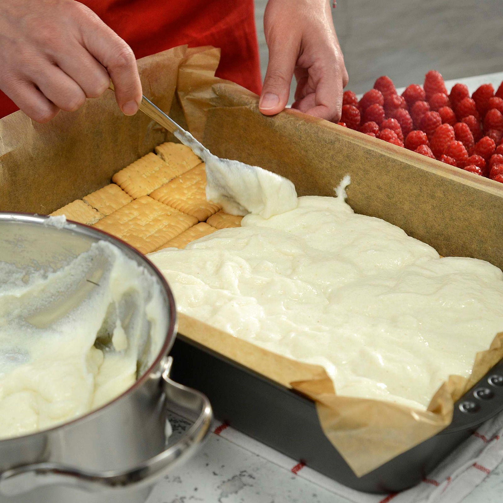 Papin kolač. Lagan i nježan kolač bez pečenja s podlogom od petit keksa i kremom od grisa i vanilije s malinama koji savršeno osvježava...