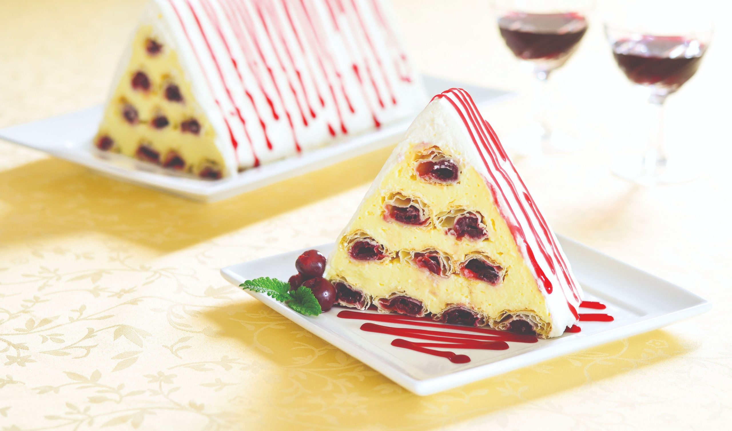 Puding i šećer pomiješati s malo mlijeka, pa ukuhati u ostatak mlijeka, dok ne postane gusto. Površinu pudinga prekriti prozirnom folijom i ostaviti da se ohladi. Izraditi maslac sobne temperature i umiksati ga u puding. Na tanjur složiti 4 pečene roladice s višnjama te premazati kremom u debljini 1 cm. Na kremu složiti 3 roladice, pa premazati kremom. Zatim 2 roladice, te opet premazati kremom. Staviti zadnju roladicu i ostatak kreme rasporediti po cijeloj piramidi.