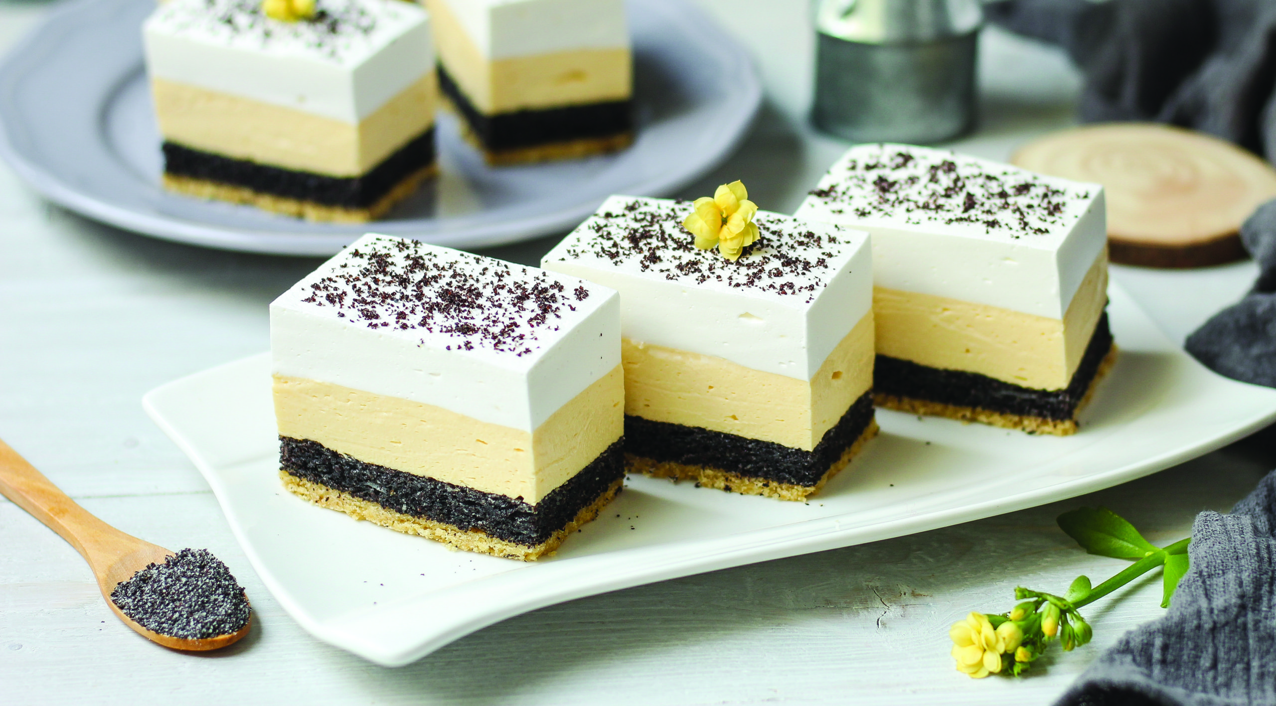Poppy kocke. Raskošne kocke s bogatim kremama od maka i vanilije na prhkoj kori ukrašene šlagom savršena je poslastica za sve ljubitelje maka u kolačima.