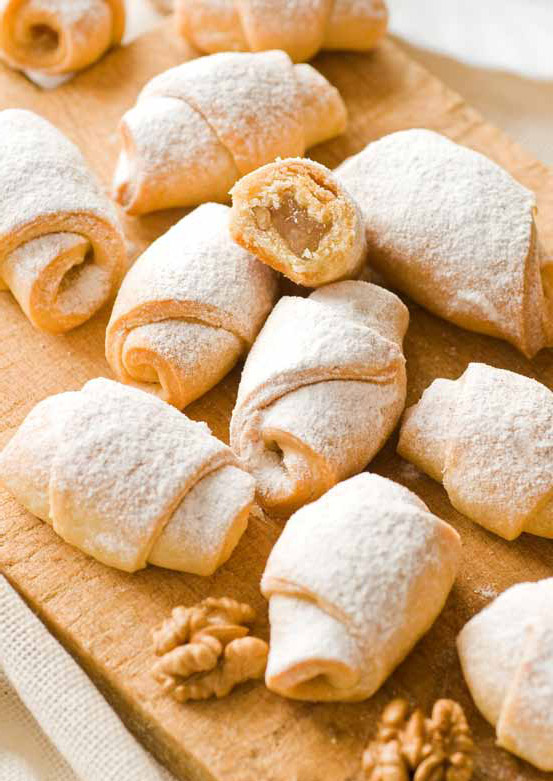 Od brašna, šećera, vanilin šećera, maslaca, jaja, badema i meda umijesimo glatko tijesto, oblikujemo ga u kuglu i ostavimo 30 minuta u hladnjaku da miruje. Tijesto premijesimo i podijelimo na manje dijelove od kojih napravimo valjčiće koje režemo na oko 6 cm duljine. Oblikujemo ih kao polumjesece. Oblikovane slažemo u lim koji smo obložili papirom za pečenje. Pečemo u zagrijanoj pećnici na 170 °C oko 15 minuta. Rastopimo još malo meda i njime premažemo još vruće kiflice, pa ih uvaljamo u smeđi šećer.