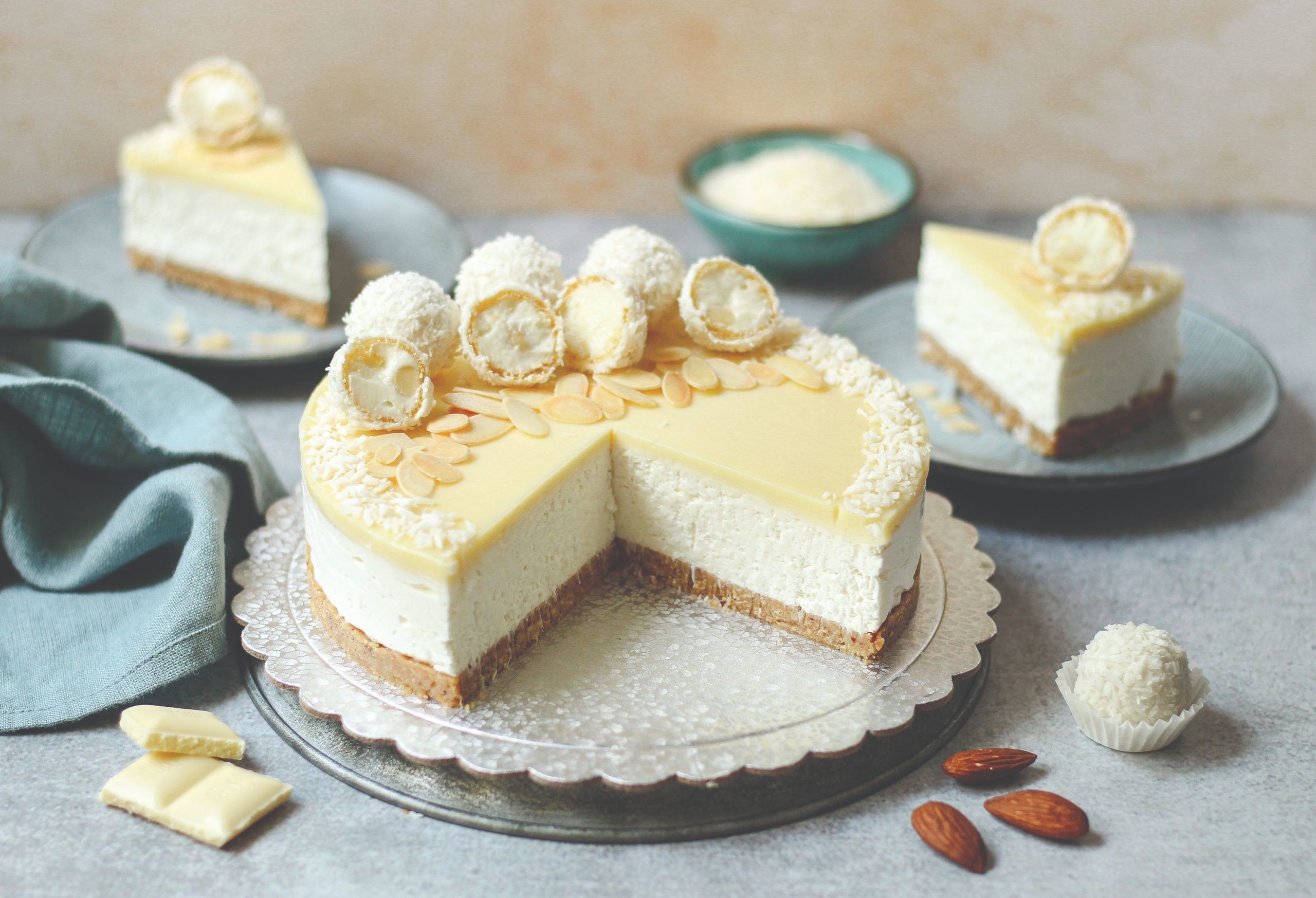 Vrhnje za šlag i bijelu čokoladu mije­šati na laganoj vatri dok se ne otopi. Malo ohladiti i preliti po kremi. Ukrasiti s kokosovim brašnom i Raffaello kuglicama.