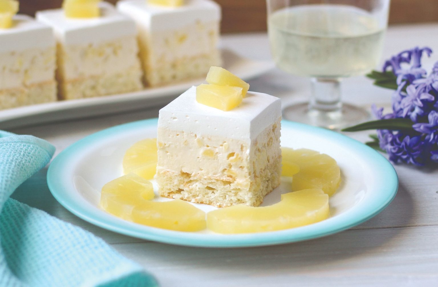 Žumanjke, šećer i vanilin šećer dobro izmiješati pjenjačom. Dodati želatinu bez prethodnog močenja i mlijeko pa sve sjediniti i kuhati na srednjoj vatri uz stalno miješanje 4 – 5 minuta. Malo ohladiti pa dodati ananas rezan na sitne kockice te mekše umućeno vrhnje za šlag. Kremu mazati na biskvit pa ukrasiti šlagom i komadićima ananasa.