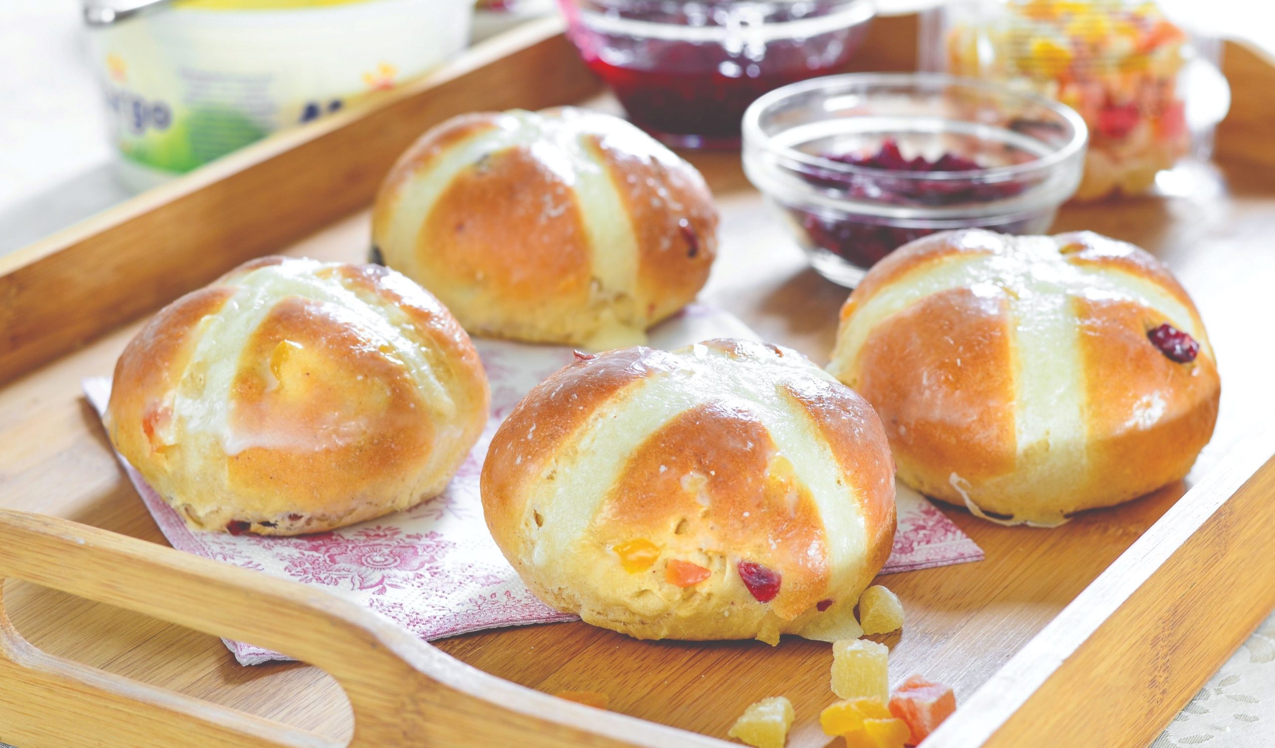 U posudu prosijati 50 dag braš­na, dodati omekšan maslac, pa zamijesiti rukama da se dobije mrvičasta smjesa. Dodati šećer, sol, cimet, mljeveni muškat­ni oraščić i kvasac, pa sve dobro zamijesi­ti. Jaje umutiti u mlakom mlijeku, pa uliti u posudu sa suhim sastojcima. Kuhačom razraditi sve u tijesto koje se ne lijepi za posudu. U tijesto postupno dodati brusni­ce i voće. Mijesiti na pobrašnjenoj podlozi oko 5 – 10 minuta. Vratiti u posudu i pokriti kuhinjskom krpom, pa staviti na toplo da se diže barem sat vremena. Premijesiti, pa podijeliti na 12 jednakih loptica. Staviti ih na papirom za pečenje obložen lim i pusti­ti još 30 minuta da se dižu. Ostatak brašna pomiješati sa 1,25 dcl vode u glatku smje­su. Staviti u slastičarsku vrećicu s malim okruglim nastavkom ili u vrećicu za zamr­zavanje s odrezanim vrhom, pa na svakoj kajzerici napraviti križ. Peći na 200 °C oko 15 minuta dok ne postanu zlatnožute.