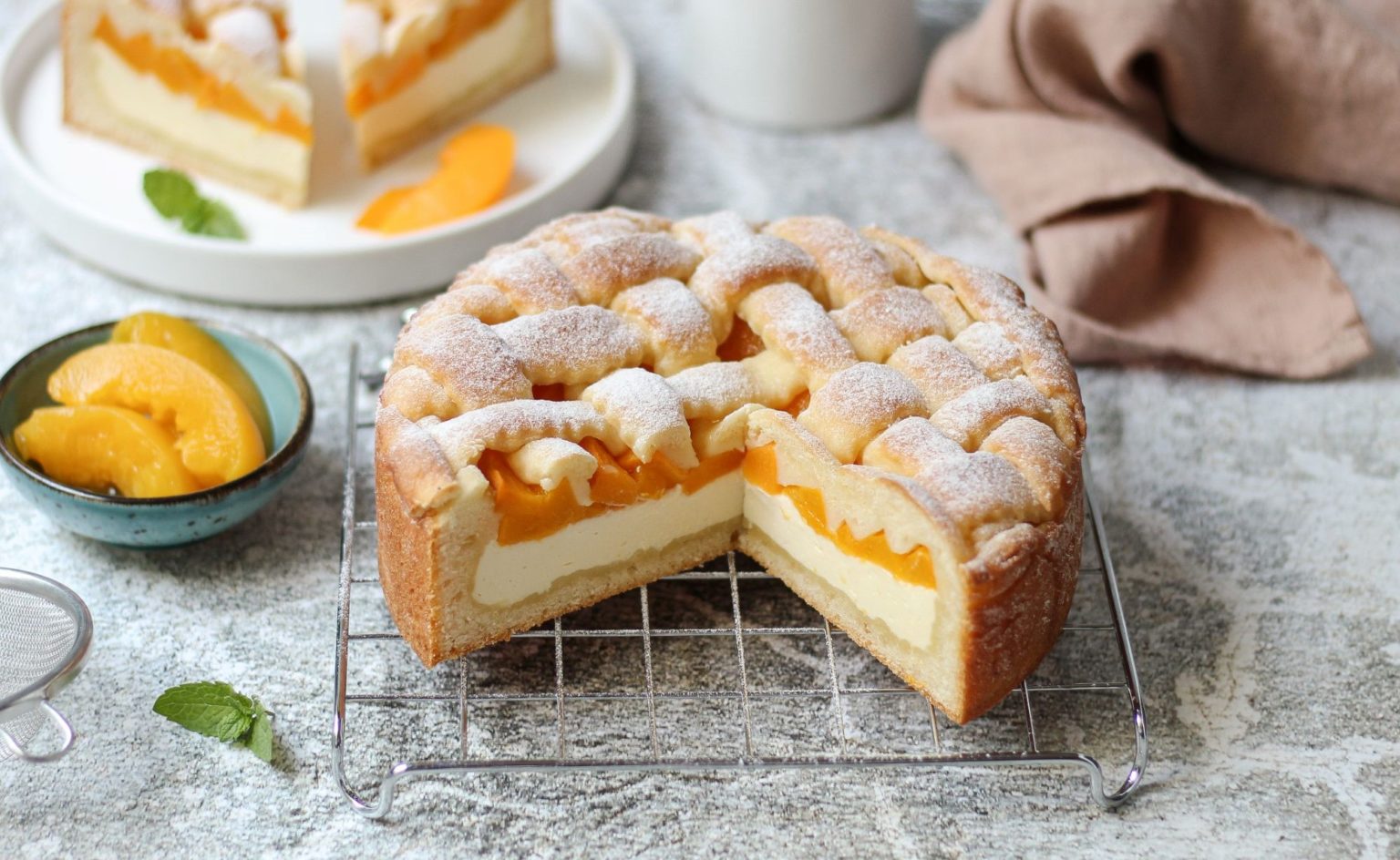 Na kremu u krug posložiti breskve na­rezane na kriške. Ostatak tijesta razvaljati na krug veličine kalupa i izrezati na trakice koje poslagati na breskve u obliku mreže. Peći 45 minuta na 180 °C. Hladno izvaditi iz kalupa i posuti šećerom u prahu.