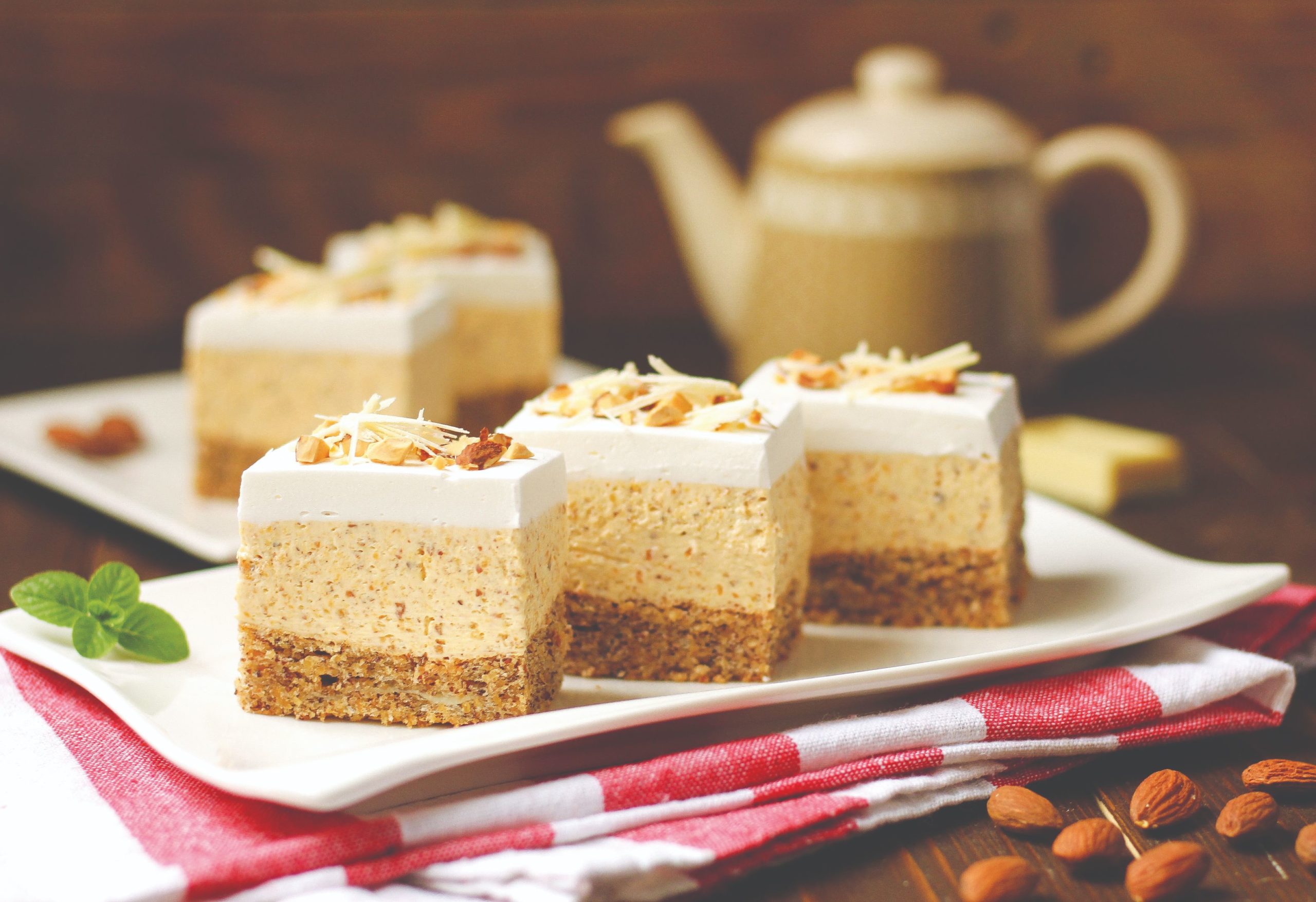 Žumanjke pjenasto izmiksati sa šećerom i vanilin šećerom. Kuhati na pari uz stalno miješanje kuhačom oko 10 minuta. Kada se počne zgušnjavati dodati bijelu čokoladu i miješati da se otopi. Maknuti s pare i malo ohladiti pa u mlako dodati maslac i izmiksati. Dodati pečene mljevene bademe i još jednom izmiksati. Na kraju ručno dodati prethodno umućeno vrhnje za šlag i lagano izmiješati. Namazati po biskvitu. Ukrasiti s čvrsto tučenim vrhnjem za šlag i po želji posuti sjeckanim bademima.