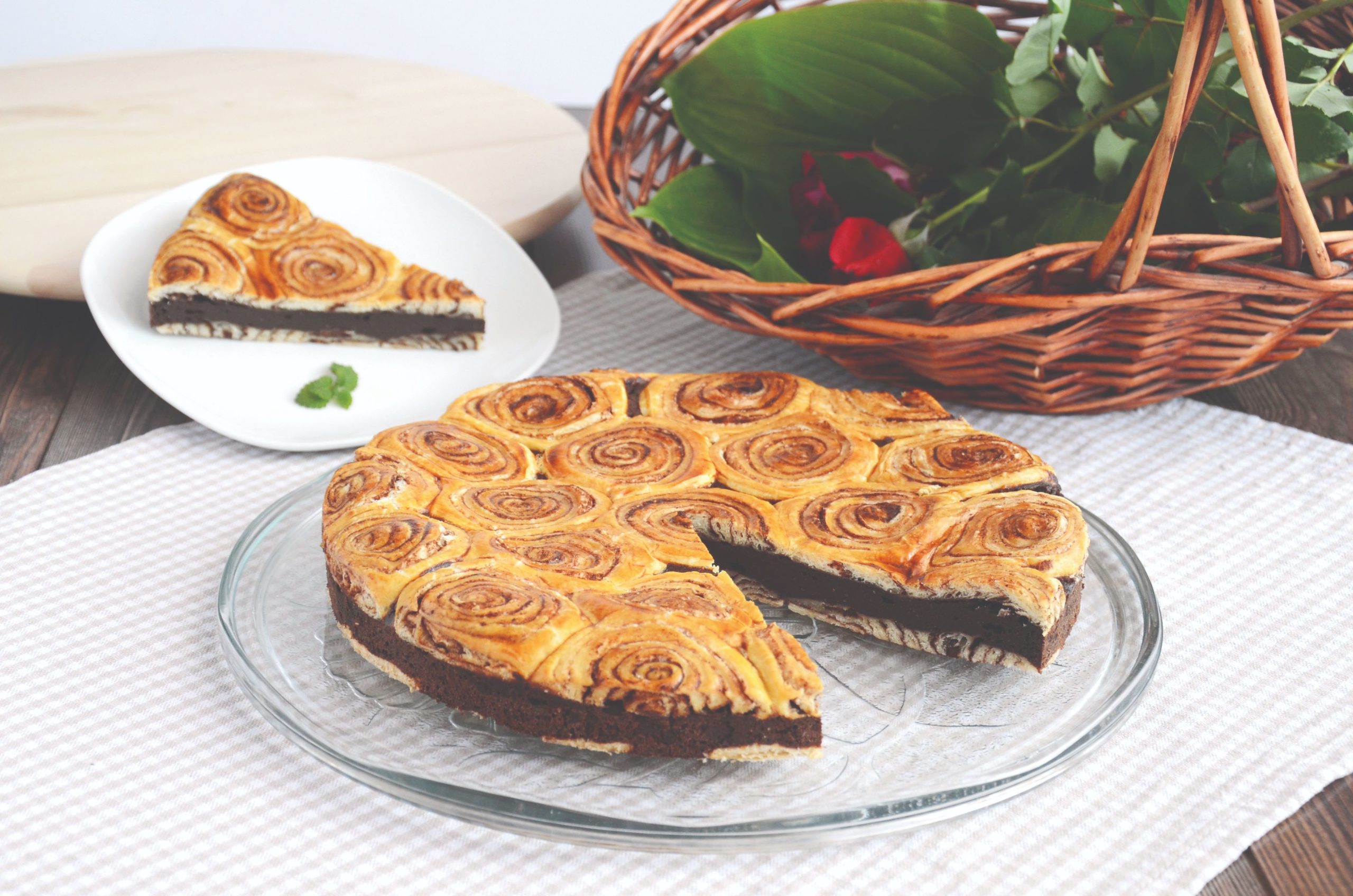 Odmrznuti lisnato tijesto i razvući dva kvadrata dimenzije 30 x 30 cm. Premazati svaki kvadrat tijesta s otopljenim maslacem i posuti s kakaom pomiješanim sa šećerom u prahu pomoću sita. Zarolati i rezati na ploške debljine 1,5 cm. Kalup 26 cm premazati maslacem ili staviti papir za pečenje i slagati pola količine ploški. Utisnuti ih prstima u kalup da se spoje. Ostatak staviti u hladnjak na papiru za pečenje.
