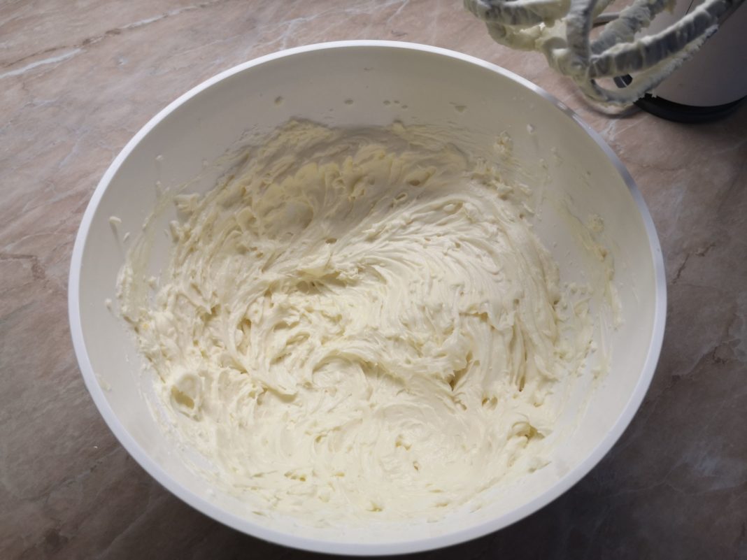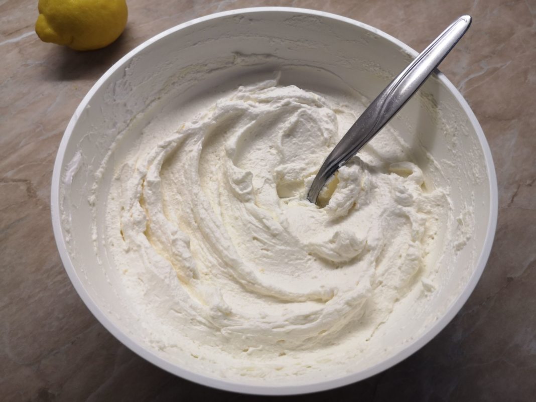 Mascarpone sir izmiksati sa šećerom u prahu, vanilin šećerom, sokom i koricom limuna. Posebno umutiti vrhnje za šlag u čvrst šlag, pa ručno umiješati.