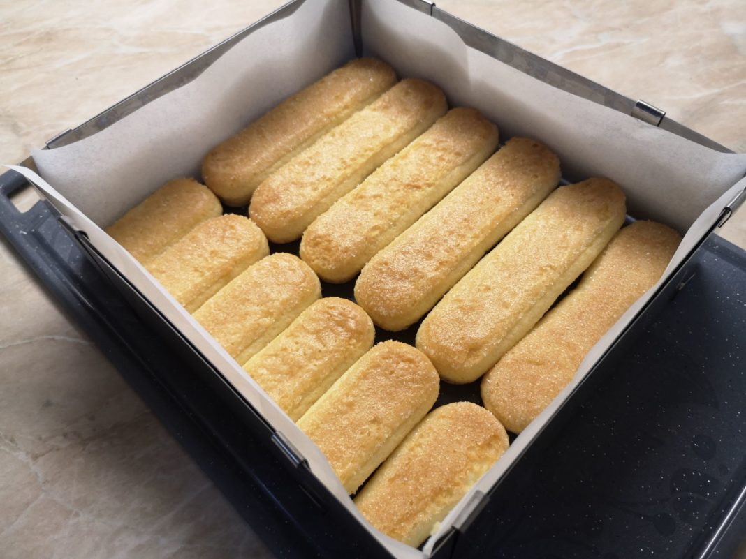 U kalup dimenzije 32 x 22 cm slagati piškote kratko provučene kroz mlako mlijeko s vanilin šećerom. Rasporediti trećinu kreme pa poslagati izrezano voće i utisnuti ga u kremu.