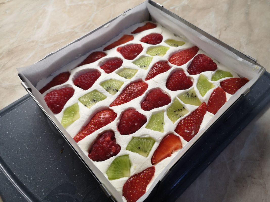 Preko voća rasporediti još malo kreme pa složiti još jedan red piškota provučenih kroz mlijeko. Završiti sa kremom i na vrh poslagati ostatak voća. Dobro ohladiti.